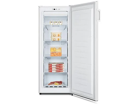 Ein weißer, aufrechter Gefrierschrank mit offener Tür, der Lebensmittel auf Glasböden zeigt.