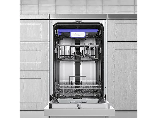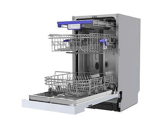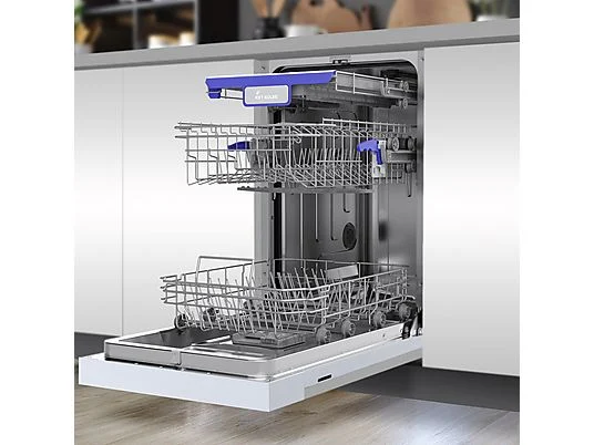 Mit einer Breite von 45cm ist dieses Gerät besonders platzsparend und ideal auch für kleinere Küchen geeignet. Der Oberkorb lässt sich manuell und innerhalb von Sekunden in der Höhe verstellen, um flexibel zusätzlichen Platz zu schaffen.
