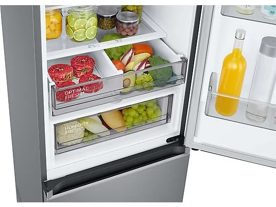 SAMSUNG RL38C775CS9/EG Kühlgefrierkombination mit Optimal Fresh- und Humidity Fresh-Schubladen, gefüllt mit Fleisch, Obst und Gemüse sowie Getränken in der Tür.