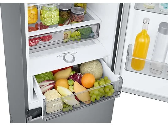 SAMSUNG RL38C775CS9/EG Kühlgefrierkombination mit geöffneter Humidity Fresh-Schublade, gefüllt mit frischem Obst und Gemüse.