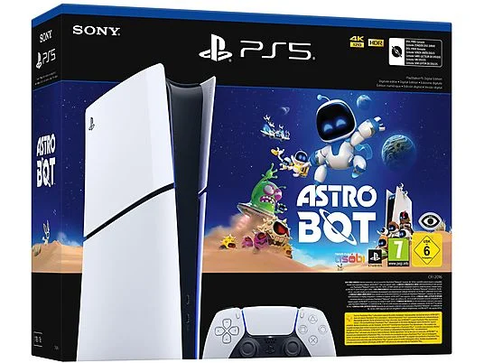 PS5® Slim Digital Edition Konsole, 1x DualSense® Wireless-Controller, 1-TB-SSD, 2 horizontale Standfüße, HDMI®-Kabel, Netzkabel, USB-Kabel, gedruckte Materialien, ASTRO’s PLAYROOM (Vorinstalliertes Spiel), Gutschein für die ASTRO BOT-Vollversion* (* Zum Einlösen des Gutscheins sind ein Konto für PlayStation Network und eine Internetverbindung erforderlich.)