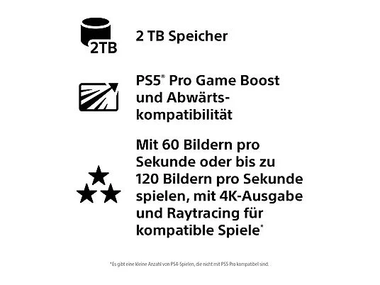 Mit der PlayStation®5 Pro-Konsole können die weltbesten Spieleentwickler ihre Spiele mit unglaublichen Funktionen wie fortschrittlichem Raytracing, gestochen scharfer Bildqualität für deinen 4K-Fernseher und Gameplay mit hoher Bildfrequenz verbessern.* Das bedeutet, dass du PS5®-Spiele mit der beeindruckendsten Grafik spielen kannst, die je auf einer PlayStation®-Konsole möglich war. Dank des mitgelieferten SSD-Speichers mit 2 TB hast du deine Lieblingsspiele stets griff- und spielbereit und kannst dich sofort ins nächste spannende Abenteuer stürzen.(3)